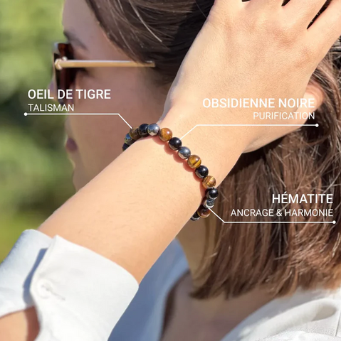 En plus d'être très tendance, ce bracelet est doté de puissantes vertus de par sa composition. L'association de trois pierres naturelles, qui sont l'Œil de Tigre, l'Hématite et l’Obsidienne, apporte une puissante protection. Il vous protégera de toutes les ondes négatives et vous aidera à recentrer vos énergies. Portez ce bracelet quotidiennement sur vous et il vous rendra plus fort(e) et plus confiant(e) !