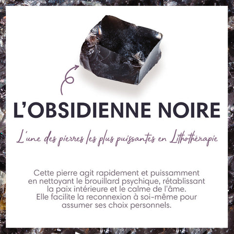 - L'Obsidienne Noire - C'est l'une des pierres les plus puissantes en Lithothérapie ! Elle agit rapidement avec beaucoup de force. Elle nettoie le brouillard psychique créé dans votre aura et apporte une énergie très importante qui permet pour celui qui la porte de retrouver la paix intérieur et le calme de l'âme. Ainsi, elle vous aidera à vous reconnecter avec vous même et à votre propre identité afin d'assumer vos choix personnels.