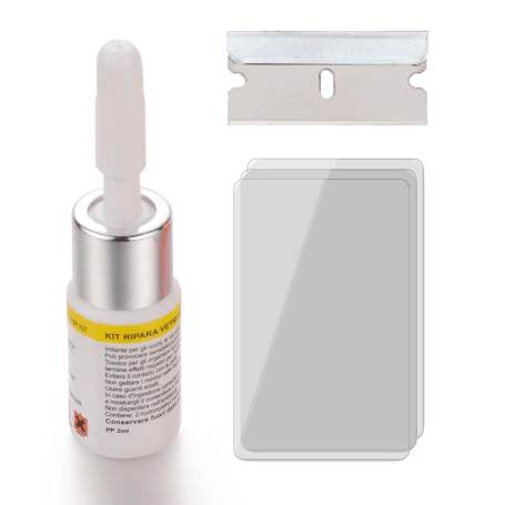 Le kit comprend tout le nécessaire pour une réparation de qualité. La résine de réparation prête à l'emploi simplifie le processus d'application. Elle élimine le besoin de mélanger ou de faire chauffer les matériaux. Les ingrédients correspondent aux qualités optiques du verre, ils permettent ainsi une réparation propre et invisible.